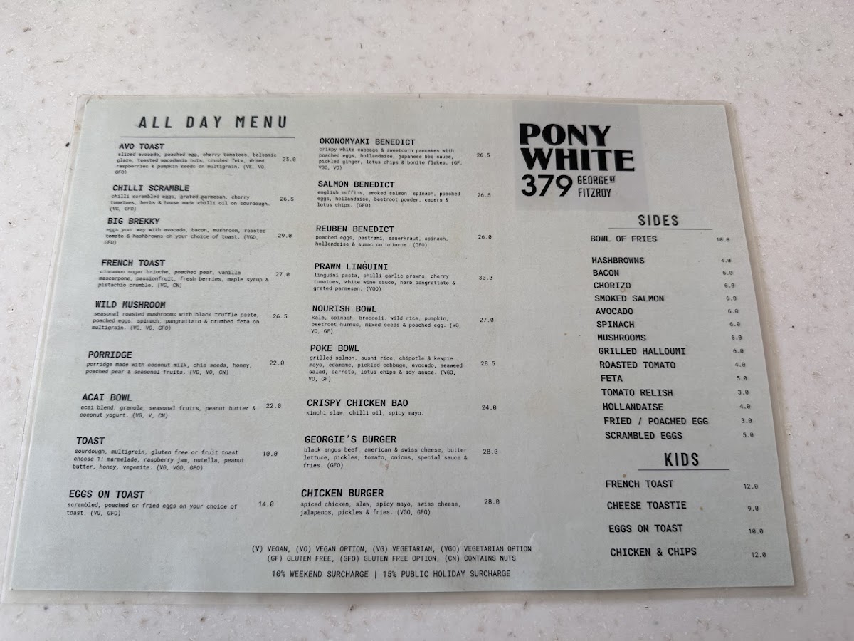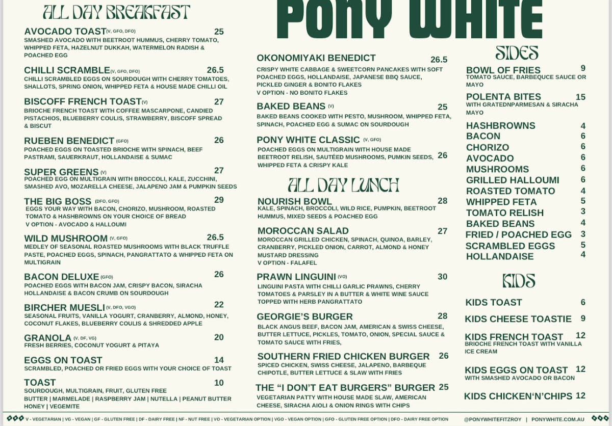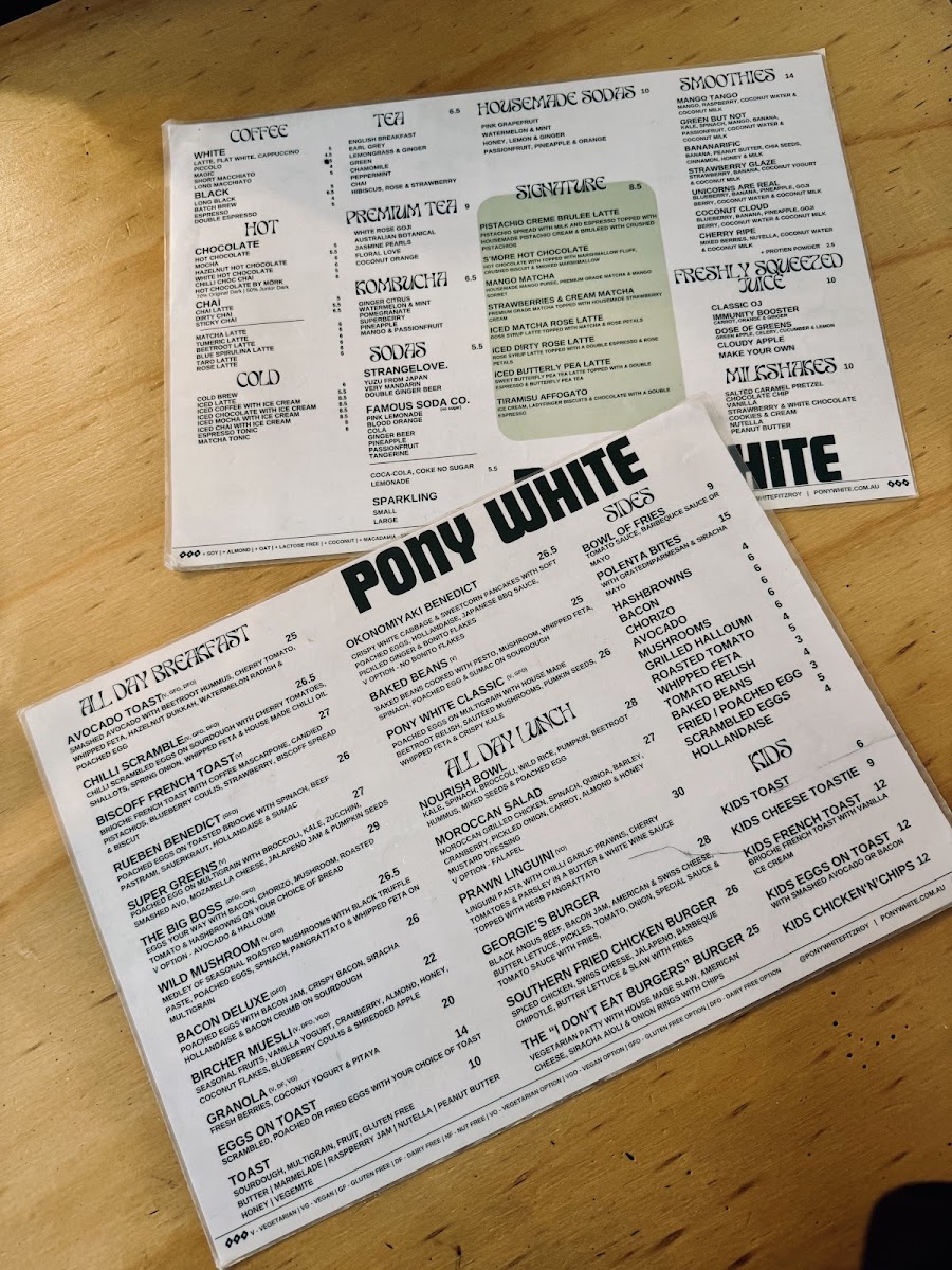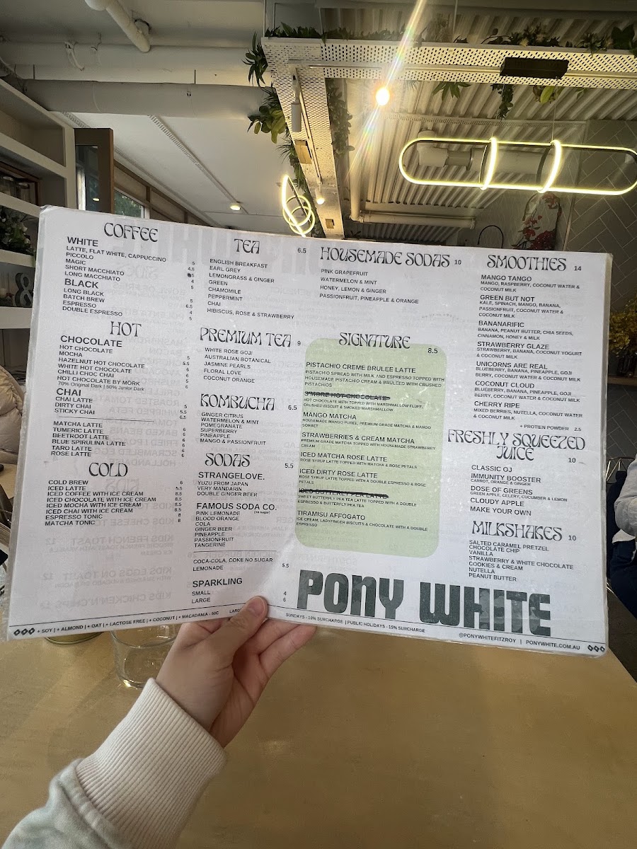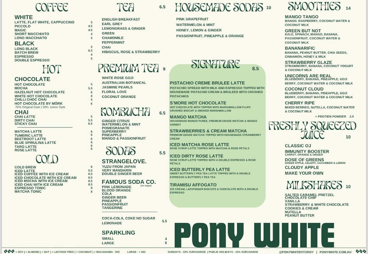 Welcome to Pony White, a charming cafe nestled at 379 George St, Fitzroy, VIC. This vibrant spot is not just about coffee; it’s an experience that tantalizes all your senses. The menu showcases a delightful range of hot beverages, including the popular Sticky Chai and various innovative milkshakes like Peanut Butter and Cookies & Cream, each priced at A$10. Unique house-made sodas, such as Watermelon & Mint, offer refreshing alternatives for warmer days.